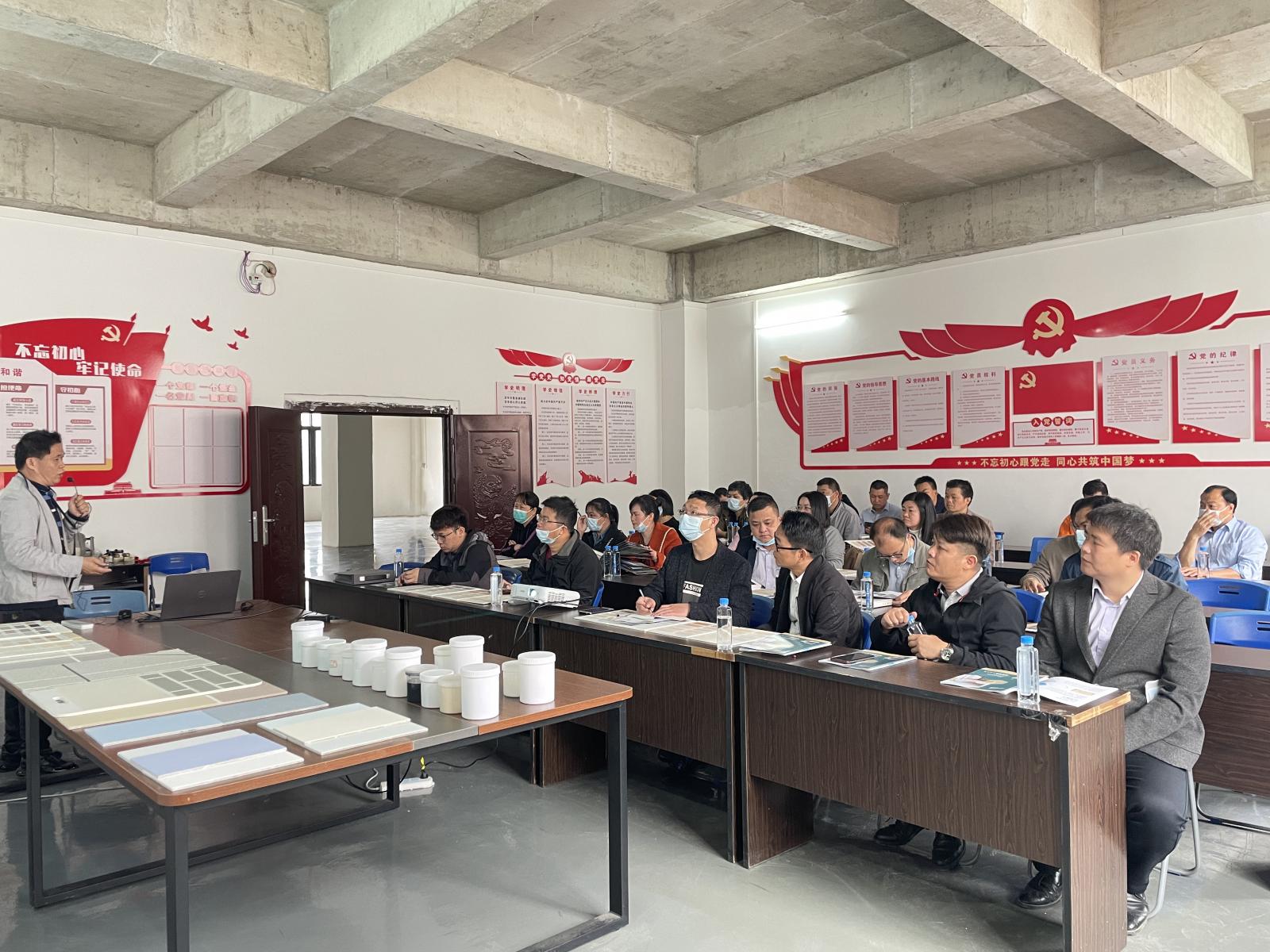 随后全体人员移步基地5楼党员活动室,进行涂料理论知识的培训,理论知识讲解过程中,公司技术总工程师通过样板、样板册及成品湿样的附带讲解,同时,引导同事们上讲台亲自触摸涂料样板、观察产品湿样,让同事们对涂料的理论知识有更高的接受度,也对公司产品的质量有更直观的认识。
