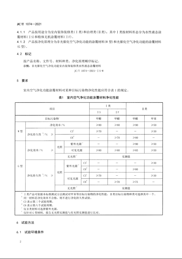 (3)是有“抗甲醛、净味甲醛”等字样的产品,还要符合JC/T 1074-2021《室内空气净化功能涂覆材料净化性能》中的各项指标要求,标准中规定此类功能性涂料:甲醛的净化效率≥80%,净化效果持久性≥70%。
