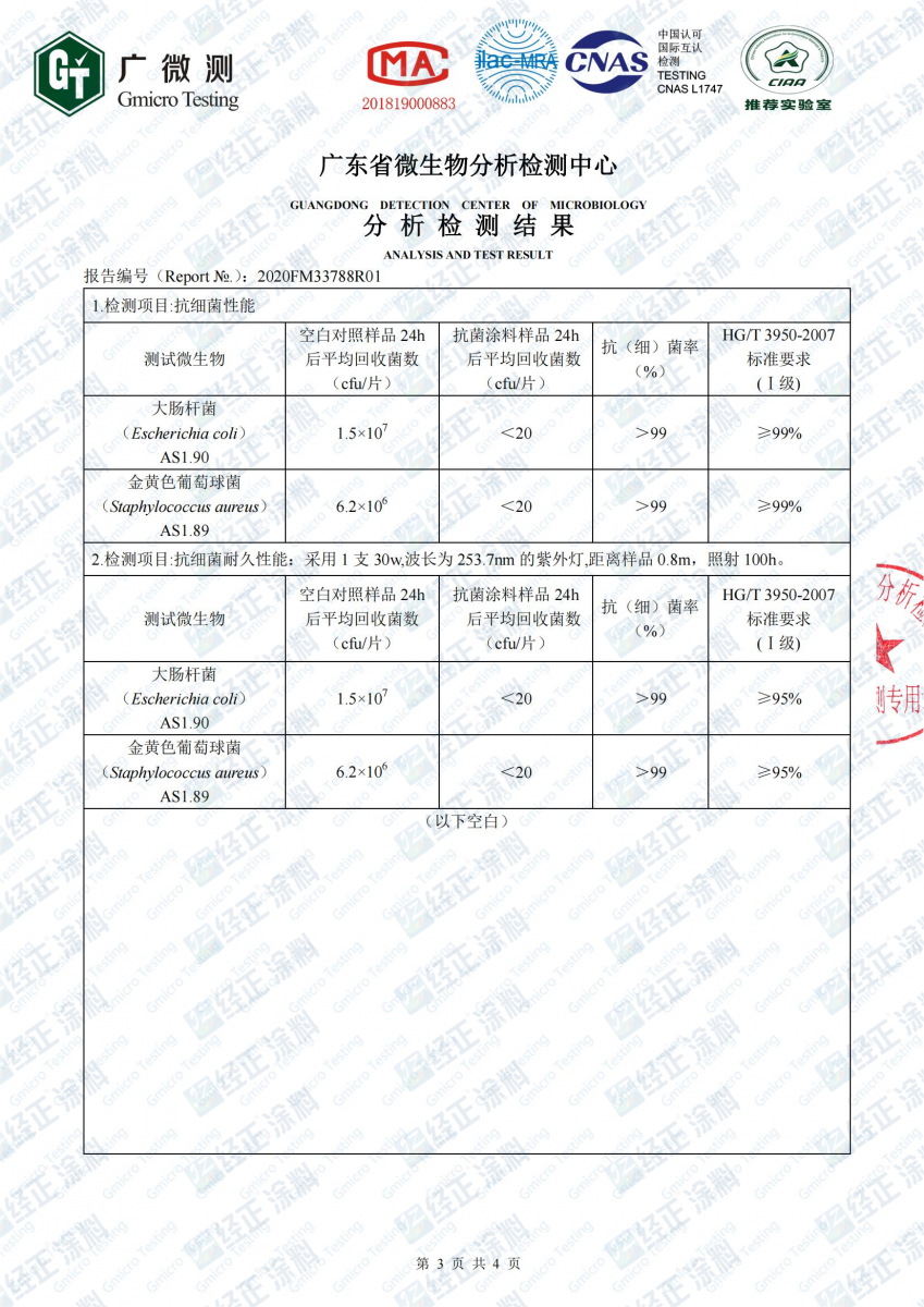 (4)是有“防霉”或“抗菌”等字样的产品,防霉产品要符合GB/T 1741-2007《漆膜耐霉性测定法》中耐霉菌测试等级评定≤1级。抗菌产品要符合HG/T 3950-2007《抗菌涂料》中抗细菌性能≥Ⅰ级或Ⅱ级,抗细菌耐久性能≥Ⅰ级或Ⅱ级。Ⅰ级适用于抗菌性能要求高的场所,Ⅱ级适用于有抗菌性能要求的场所。
