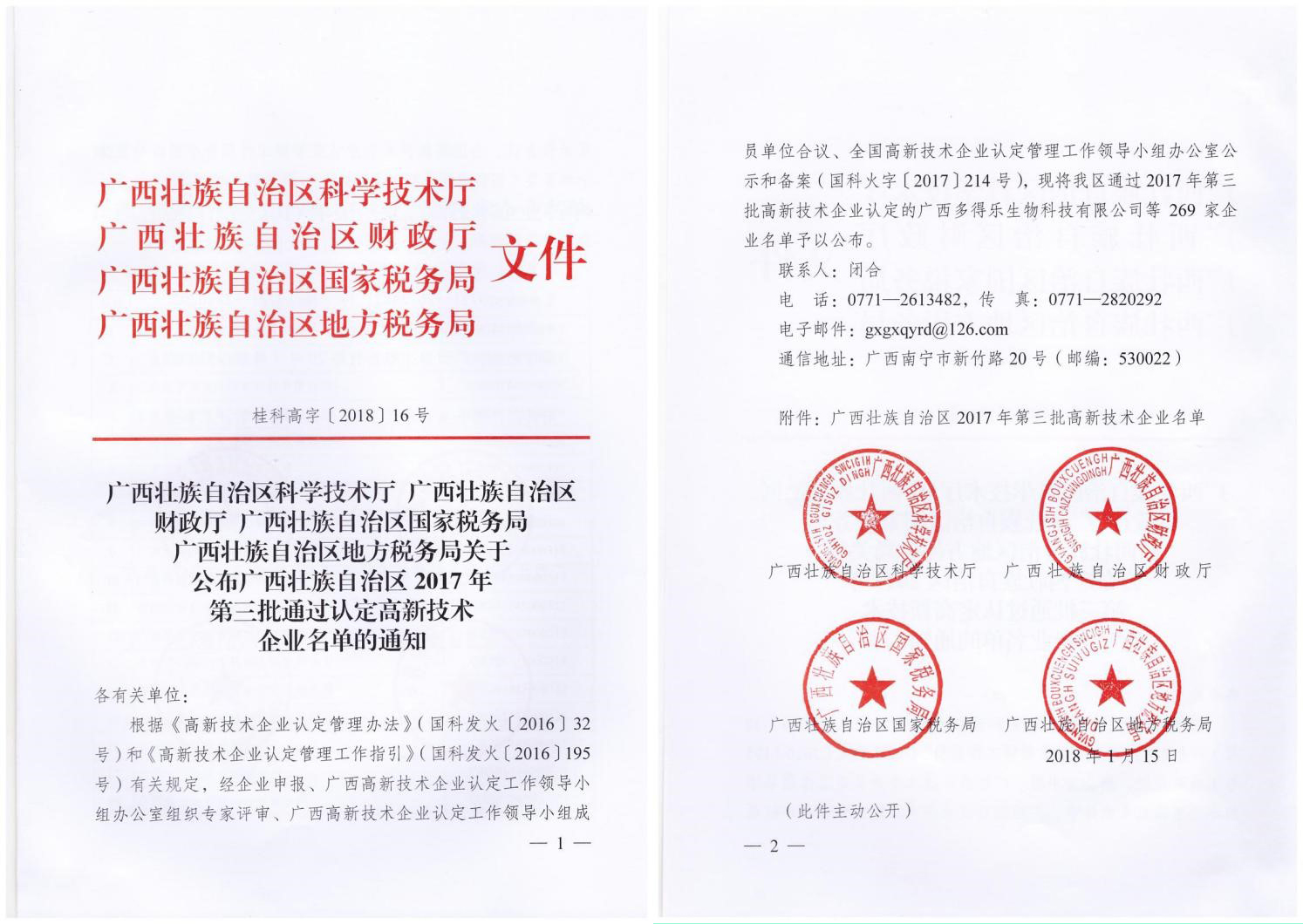 在辞旧迎新的2018年1月,从广西科技厅网站获悉,根据国家《高新技术企业认定管理办法》和《高新技术企业认定管理工作指引》的相关规定,经正科技被认定为国家级高新技术企业。1月29日,公司领取了由广西科技厅、广西财政厅、广西区国家税务局、广西区地方税务局联合颁发的“国家高新技术企业”认定证书及铜牌。由此,公司正式迈入国家高新技术企业行列。