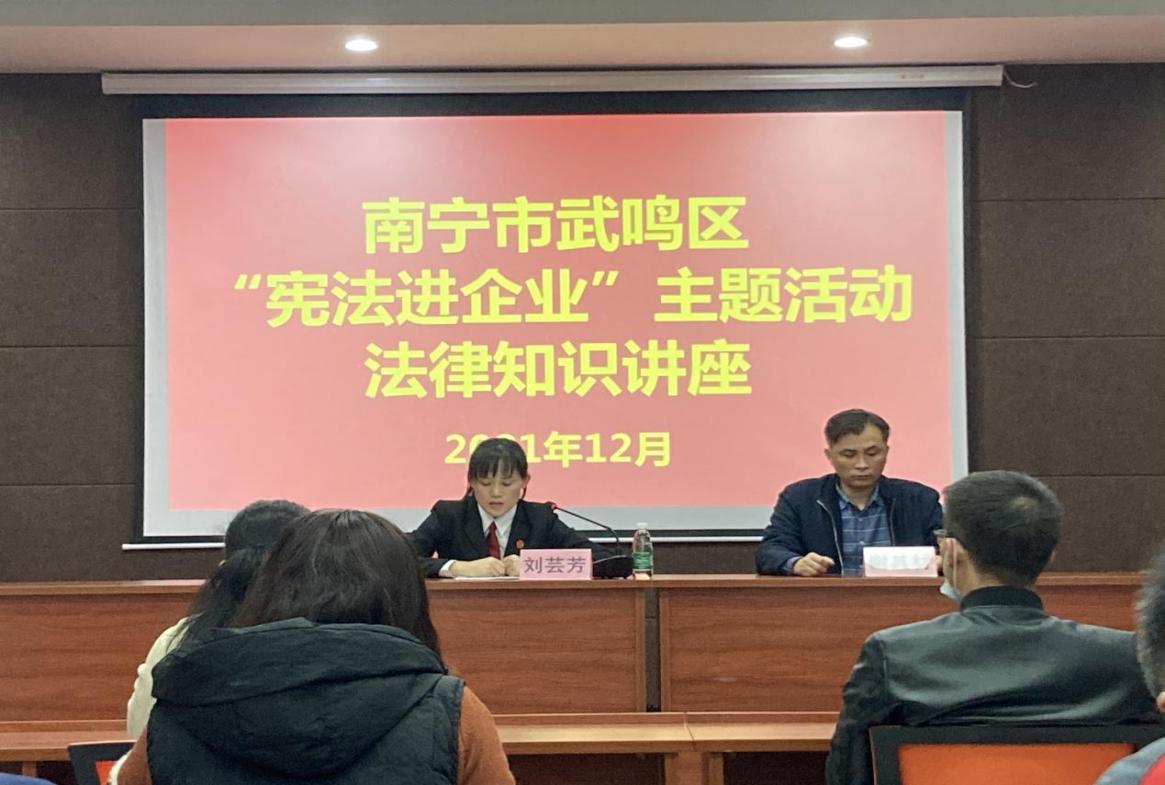2021年12月4日是第八个国家宪法日。为做好宪法集中宣传活动,武鸣区工商联合会于2021年12月3日下午举办以“宪法进企业”为主题的法律知识讲座,我司派代表参加本次讲座。