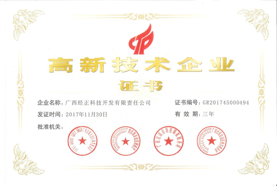 在辞旧迎新的2018年1月,从广西科技厅网站获悉,根据国家《高新技术企业认定管理办法》和《高新技术企业认定管理工作指引》的相关规定,经正科技被认定为国家级高新技术企业。1月29日,公司领取了由广西科技厅、广西财政厅、广西区国家税务局、广西区地方税